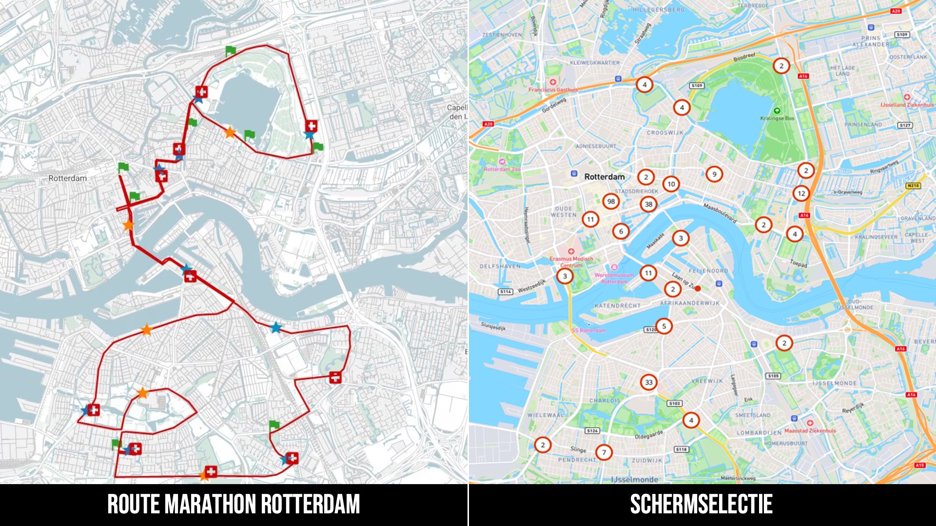 Zie op de afbeelding hieronder de route van de marathon in combinatie met de schermselectie.